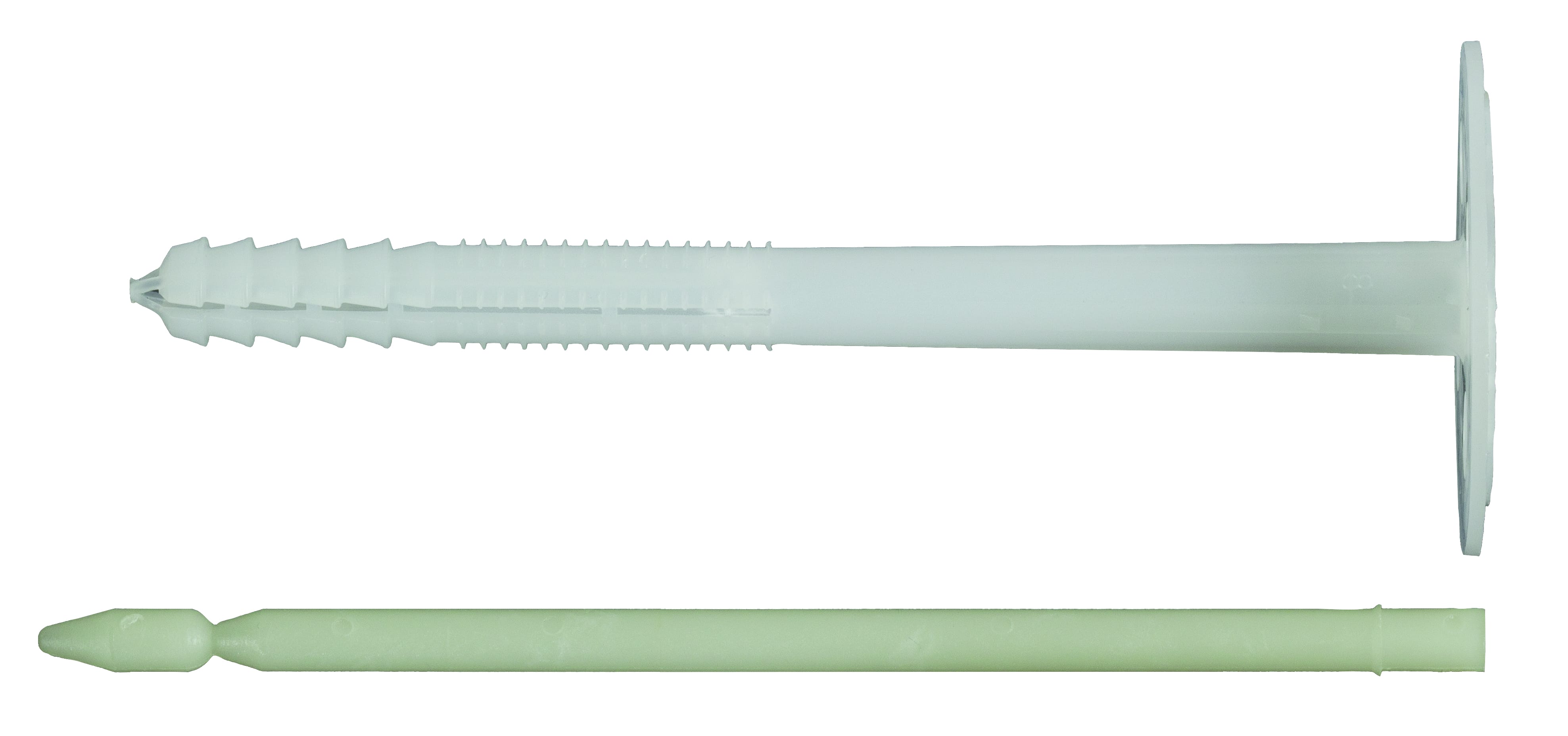 Il fissaggio per materiali isolanti fischer DIPK costituito da un corpo espandente bianco con piastra integrata e una spina di plastica rinforzata in fibra di vetro. Il DIPK è applicato a percussione con l'ausilio di un martello. Battendo la spina si provoca l'espansione fel fissaggio nel materiale di supporto. In materiali pieni è necessario accorciare la spina fibrorinforzata (GRP) al punto di rottura predeterminato. Il fissaggio per materiali isolanti fischer DIPK è ideale per il fissaggio di materiali isolanti resistenti alla pressione, come pannelli di polistirene, pannelli da costruzione leggeri in lana di vetro e pannelli PU in calcestruzzo, mattoni pieni e semipieni.