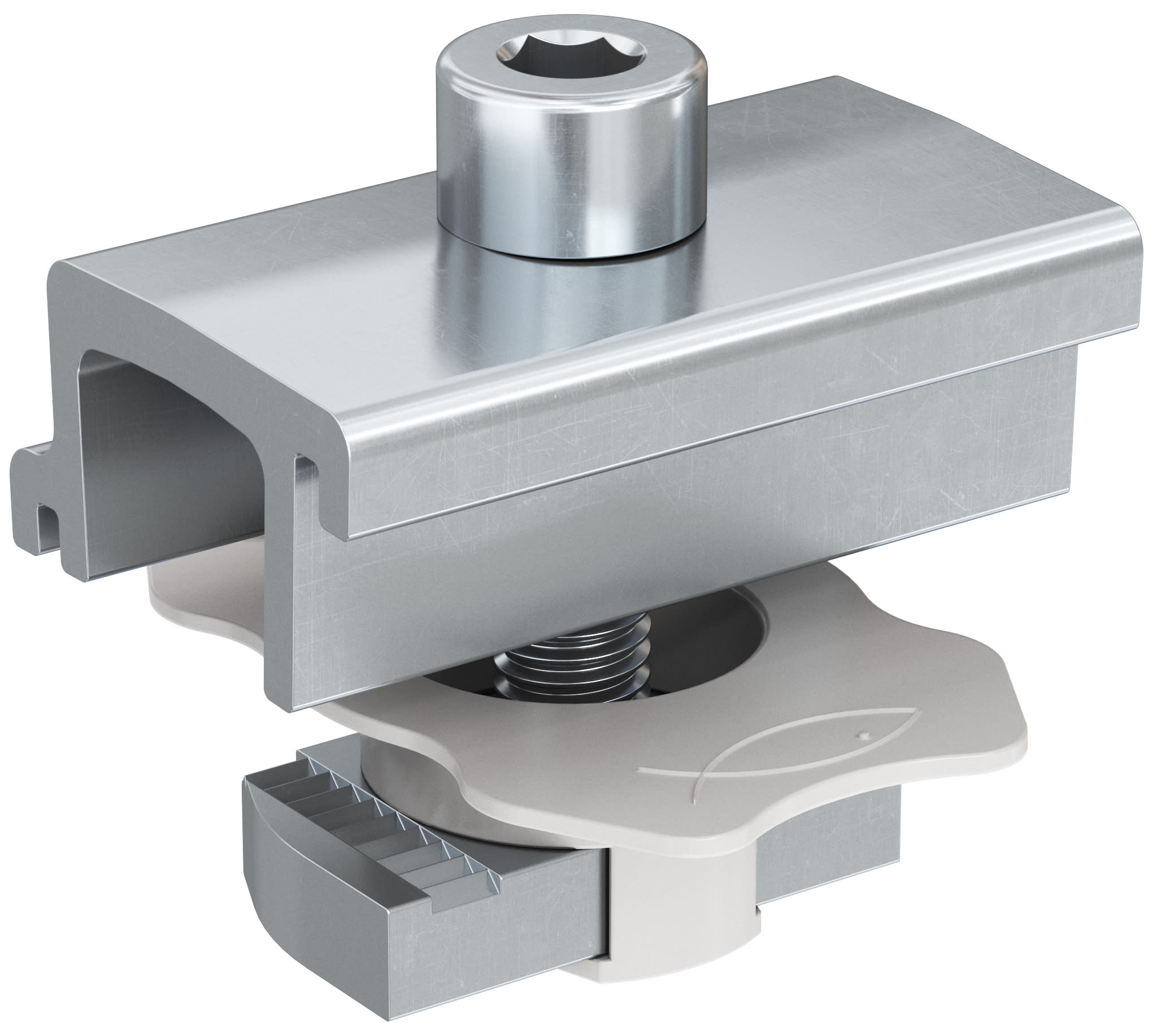 - Collegare la staffa di collegamento XC alla cava superiore del profilo Solar inferiore attraverso il dado testa a martello FCN AL M 8 e la vite SKS M 8, inserire la parte inferiore della staffa di collegamento preassemblata PXC nella cava superiore del profilo Solar inferiore e ruotarla di 90°.