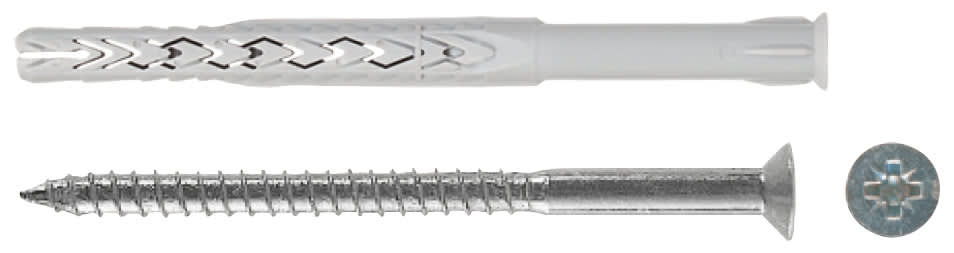 Tassello prolungato in nylon con vite a testa svasata piana ed impronta Pozidrive