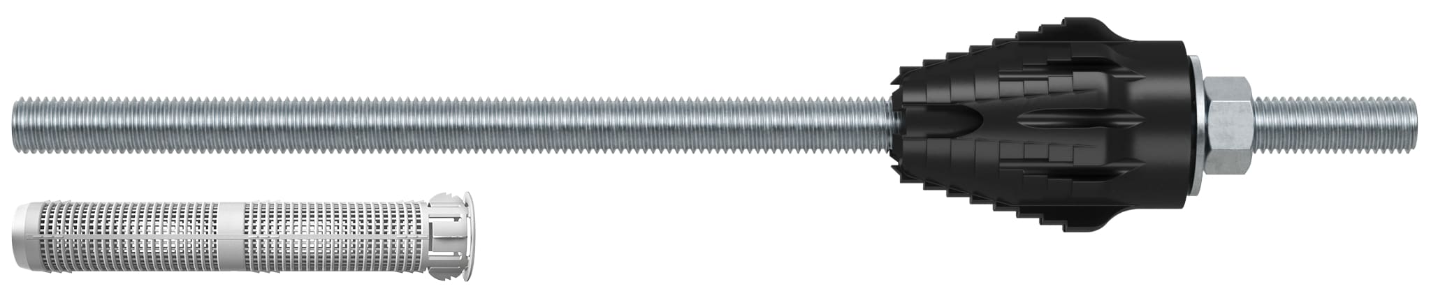- Il cono autoforante, rinforzato in fibra di vetro, ricava la propria sede nell'isolamento attraversando l'intonaco durante l'installazione.