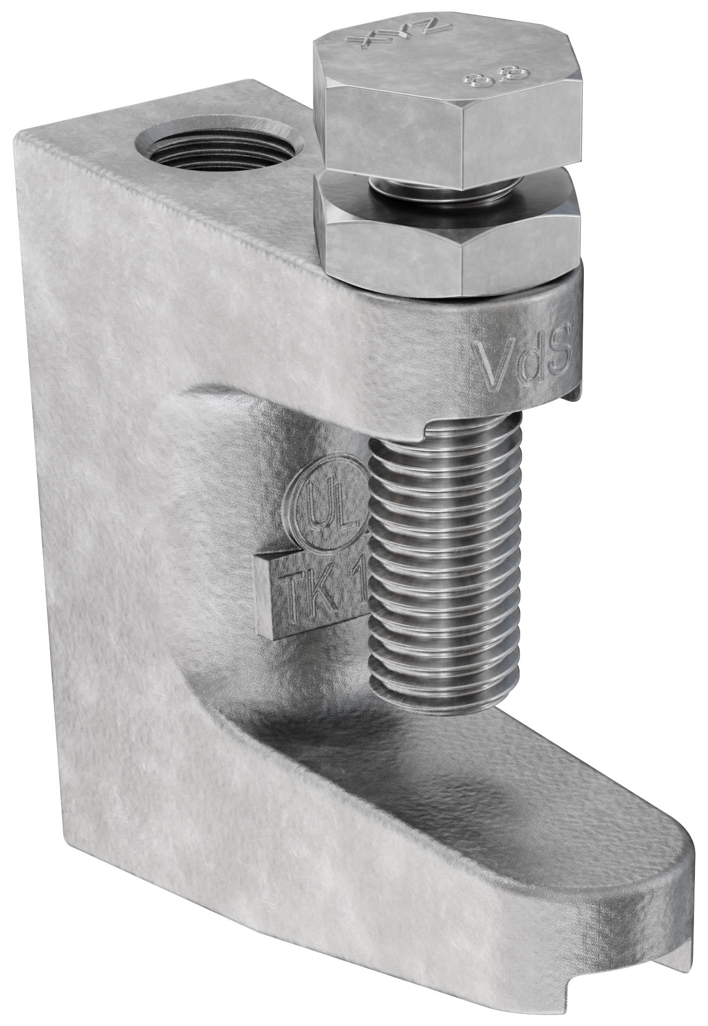 Il morsetto di serraggio fischer con foro filettato per un semplice fissaggio a travi d'acciaio tramite fascette. Strap di sicurezza sono necessarie per attrezzature VdS sopra DN 65. Il taglio della cavità della vite di fissaggio impedisce efficacemente lo scivolamento dalla trave in acciaio.