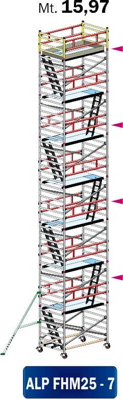 TRABATTELLO PROFESSIONALE IN ALLUMINIO CON ELEMENTI AD AGGANCIO RAPIDO E SCALETTE INTERNE ALTO mt 15,97 CON DIMENSIONI DI BASE mt 1,35x2,55 DOTATO DI: n?4 LIVELLATORI A VITE CON RUOTA 150mm ANTI-SCHIACCIAMENTO CON FRENO A DOPPIA LEVA, n?7 PIANI LAVORO, n?1 FERMAPIEDE, n?14 PARAPETTI, n?4 STAFFE STABILIZZATRICI REGOLABILI, n?1 SCALA DI BASE SEMPLICE, n?6 SCALE INTERMEDIE - VERSIONE CERTIFICATA SECONDO NORMATIVA EUROPEA EN1004-1/2 CON USO SENZA ANCORAGGIO