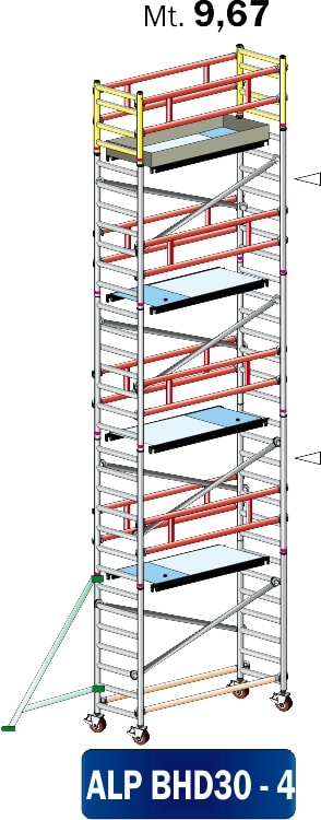 TRABATTELLO PROFESSIONALE IN ALLUMINIO CON ELEMENTI AD AGGANCIO RAPIDO ALTO mt 9,67 CON DIMENSIONI DI BASE mt 0,74x3,10 DOTATO DI: n?4 LIVELLATORI A VITE CON RUOTA 150mm ANTI-SCHIACCIAMENTO CON FRENO A DOPPIA LEVA, n?4 PIANI LAVORO, n?1 FERMAPIEDE, n?8 PARAPETTI, n?4 STAFFE STABILIZZATRICI REGOLABILI - VERSIONE CERTIFICATA SECONDO NORMATIVA EUROPEA EN1004-1/2 CON USO SENZA ANCORAGGIO