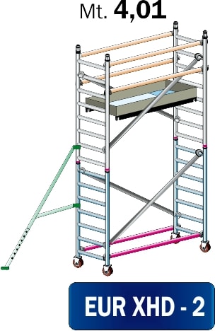 TRABATTELLO PROFESSIONALE IN ALLUMINIO CON ELEMENTI AD AGGANCIO RAPIDO ALTO mt 4,01 CON DIMENSIONI DI BASE mt 0,80x1,60 DOTATO DI: n?4 RUOTE 125mm ANTI-SCHIACCIAMENTO CON FRENO ANTERIORE, n?1 PIANO LAVORO, n?1 FERMAPIEDE, n?2 PARAPETTI, n?2 TRAVERSE DI BASE ZAVORRATE, n?4 STAFFE STABILIZZATRICI REGOLABILI TELESCOPICHE ZAVORRATE - VERSIONE CERTIFICATA SECONDO NORMATIVA EUROPEA EN1004-1/2 CON USO SENZA ANCORAGGIO
