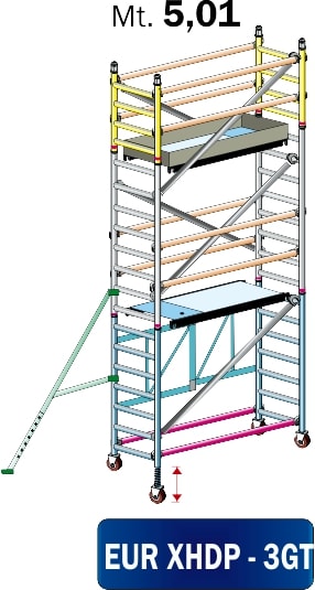 TRABATTELLO PROFESSIONALE IN ALLUMINIO CON ELEMENTI AD AGGANCIO RAPIDO E SEZIONE DI BASE PIEGHEVOLE ALTO mt 5,01 CON DIMENSIONI DI BASE mt 0,80x1,60 DOTATO DI: n?4 LIVELLATORI A VITE CON RUOTA 125mm ANTI-SCHIACCIAMENTO CON FRENO ANTERIORE, n?2 PIANI LAVORO, n?1 FERMAPIEDE, n?4 PARAPETTI, n?2 TRAVERSE DI BASE ZAVORRATE, n?4 STAFFE STABILIZZATRICI REGOLABILI TELESCOPICHE ZAVORRATE - VERSIONE CERTIFICATA SECONDO NORMATIVA EUROPEA EN1004-1/2 CON USO SENZA ANCORAGGIO
