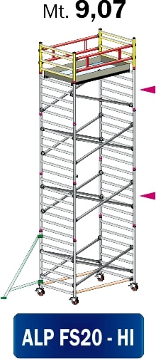 TRABATTELLO PROFESSIONALE IN ALLUMINIO CON ELEMENTI AD AGGANCIO RAPIDO ALTO mt 9,07 CON DIMENSIONI DI BASE mt 1,35x1,97 DOTATO DI: n?4 LIVELLATORI A VITE CON RUOTA 150mm ANTI-SCHIACCIAMENTO CON FRENO A DOPPIA LEVA, n?1 PIANO LAVORO, n?1 FERMAPIEDE, n?2 PARAPETTI, n?4 STAFFE STABILIZZATRICI REGOLABILI - VERSIONE CONFORME SECONDO NORMATIVA ITALIANA D.Lgs.n?81 CON OBBLIGO DI ANCORAGGIO
