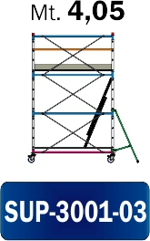 TRABATTELLO PROFESSIONALE IN FERRO ZINCATO TIPO TRADIZIONALE ALTO mt 4,05 CON DIMENSIONI DI BASE mt 1,20x2,50 DOTATO DI: n?1 PIANO LAVORO COMPLETO, n?1 MEZZO PIANO DI BASE, n?1 FERMAPIEDE, n?2 PARAPETTI TERMINALI, n?1 BASE RIGIDA A MONTAGGIO RAPIDO, n?4 STAFFE STABILIZZATRICI REGOLABILI, n?4 RUOTE 200mm ANTI-SCHIACCIAMENTO CON FRENO ANTERIORE, n?1 SCALA DI BASE A SFILO - VERSIONE CERTIFICATA SECONDO NORMATIVA EUROPEA EN1004-1/2 CON USO SENZA ANCORAGGIO
