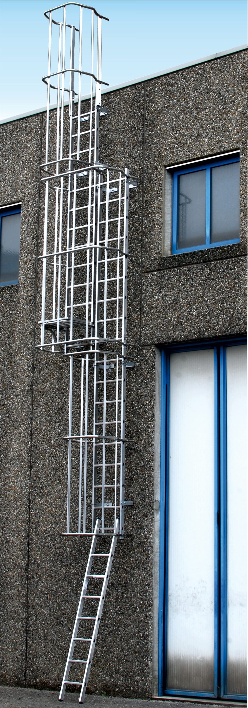 SCALA FISSA VERTICALE A PIOLI ALLA MARINARA CON GABBIA DI PROTEZIONE ALLA SCHIENA - LARGHEZZA SCALA 52 cm - ADATTA PER ALTEZZE AL PIANO DI USCITA DA mt 14,67 a mt 14,94 - VERSIONE BASE A TRONCO SINGOLO CON GABBIA SMONTATA E ZANCHE DI FISSAGGIO STANDARD DA 18 cm REALIZZATE IN ACCIAIO ZINCATO A CALDO A POSIZIONE REGOLABILE (PIANI DI RIPOSO E MODULI DI SDOPPIAMENTO ESCLUSI) - SCALA CONFORME A NORMA ITALIANA D.Lgs.n?81 CON GABBIA DI PROTEZIONE MONTATA IN POSIZIONE STANDARD E CONFORME A NORMA EUROPEA EN14122 QUANDO MONTATA CON GABBIA DI PROTEZIONE IN POSIZIONE ALLARGATA - DOTATA DI: PIOLI mm 30x30 FISSATI AL MONTANTE CON DOPPIA BORDATURA INTERNA ED ESTERNA, PROTEZIONE TERMINALE ALLARGATA CHE PROSEGUE mt 1,10 OLTRE IL PIANO DI USCITA, SPINOTTI DI NNESTO MONTANTI SCALA REALIZZATI IN PROFILATO DI ALLUMINIO ANTI-RIGGINE, ANELLI GABBIA A POPSIZIONE REGOLABILE, STECCHE GABBIA IN PROFILATO DI ALLUMINO