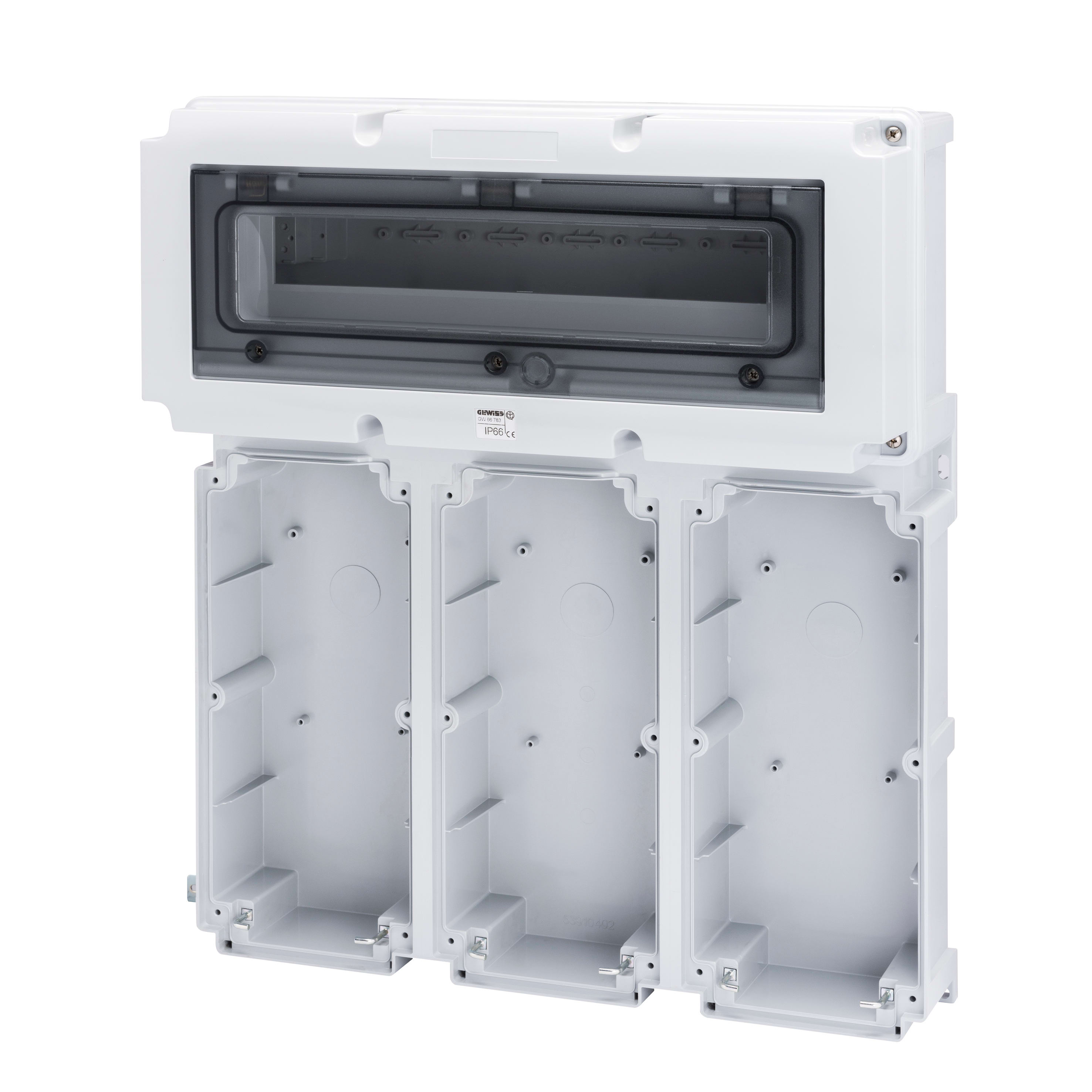 GEWISS - BASE MODULARE CON PANNELLO FINESTRATO GUIDA DIN 1 - 3 PRESE 16/32A / SELV-18 MOD.EN50022 GW66783