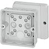 Cassetta di derivazione cavi in termoplastica di alta qualità per applicazioni a parete in edifici o installazioni protette all'esterno. Passaggio del cavo su membrane di tenuta elastiche, basta spingere il conduttore attraverso, non è necessario alcuno strumento di perforazione. Fissaggio del coperchio con viti V2A. Senza terminali.