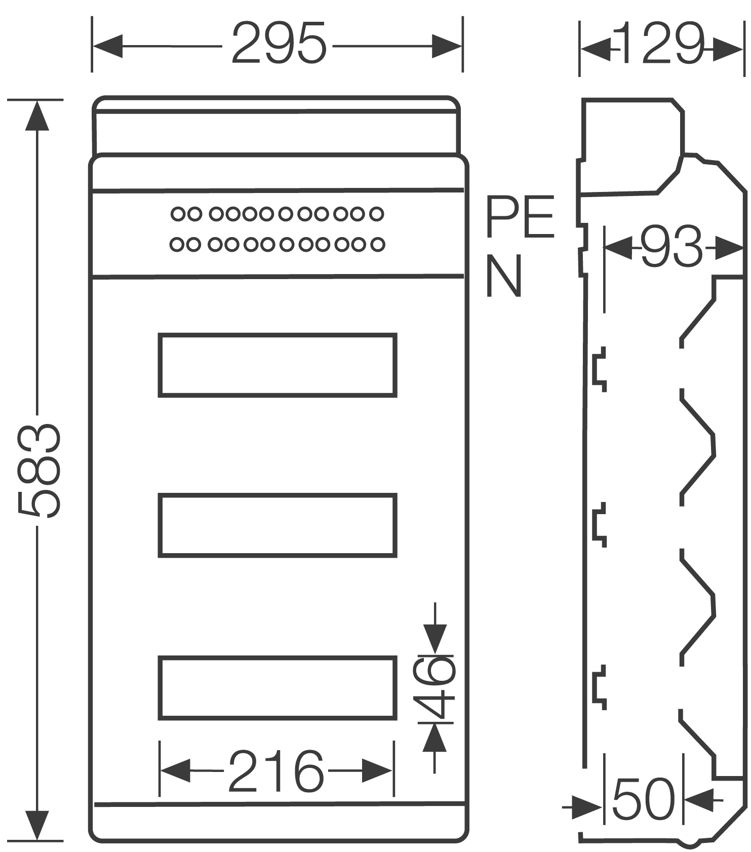 Centralino in termoplastica di alta qualità. Per applicazioni a parete in edifici o installazioni protette all'esterno. Centralino con 36 moduli per l'installazione di dispositivi con montaggio a scatto su guida di montaggio DIN. Passaggio dei cavi su membrane elastiche di tenuta integrate. Con porta trasparente e mascherina di passaggio dei cavi, scomparto per gli accessori integrato e strisce di copertura per sezione del dispositivo. Classe di protezione IP 54.