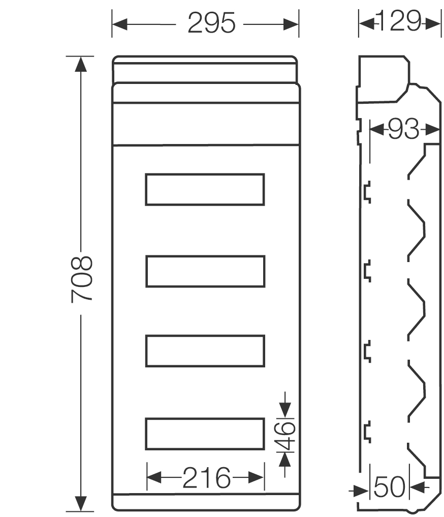 Centralino in termoplastica di alta qualità. Per applicazioni a parete in edifici o installazioni protette all'esterno. Centralino con 48 moduli per l'installazione di dispositivi con montaggio a scatto su guida di montaggio DIN. Il passaggio dei cavi avviene su prestampaggi metrici. Con porta trasparente e mascherina di passaggio dei cavi, scomparto per gli accessori integrato e strisce di copertura per sezione del dispositivo. Classe di protezione IP 54.