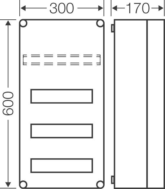 Quadro per la costruzione di combinazioni di interruttori di energia fino a 630 A o come alloggiamenti singoli. Realizzato in policarbonato di alta qualità, con isolamento di protezione. Passaggi per pannelli con grandi aperture per il collegamento elettrico degli alloggiamenti tra di loro. Ingresso cavi da tutte le pareti dell'alloggiamento su pre-stampaggio metrico o flange di montaggio. Alloggiamento per fissaggio a parete anche su alette esterne o con guide di montaggio. Quadro per interruttori modulari con 36 moduli per l'installazione di dispositivi in serie montati su guida DIN 43880. Con guida di montaggio DIN aggiuntiva per una profondità di installazione del dispositivo di 72 mm. Senza terminali PE e N. Con strisce di copertura per chiudere le sezioni inutilizzate del dispositivo e strisce di etichettatura per l'identificazione del circuito. Coperchio trasparente, chiusure del coperchio per azionamento manuale.