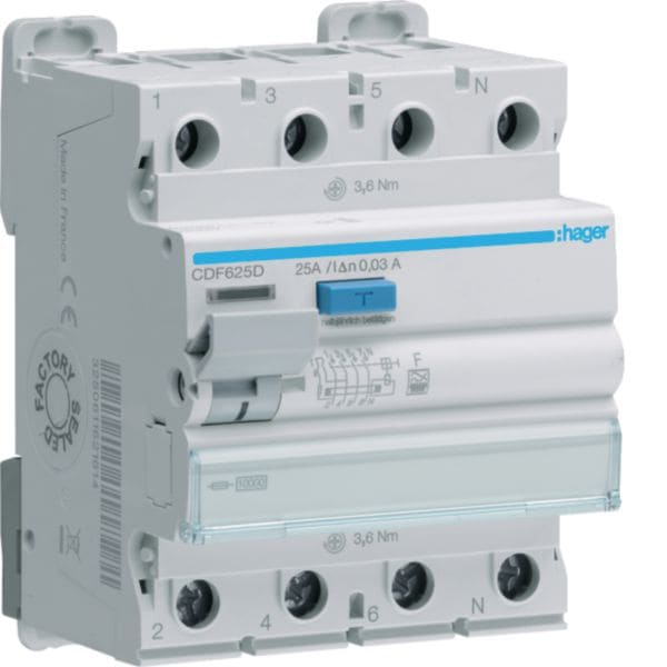 HAGER BOCCHIOTTI - Interruttore differenziale puro 3P+N 25A tipo F 30mA 4M CDF625D