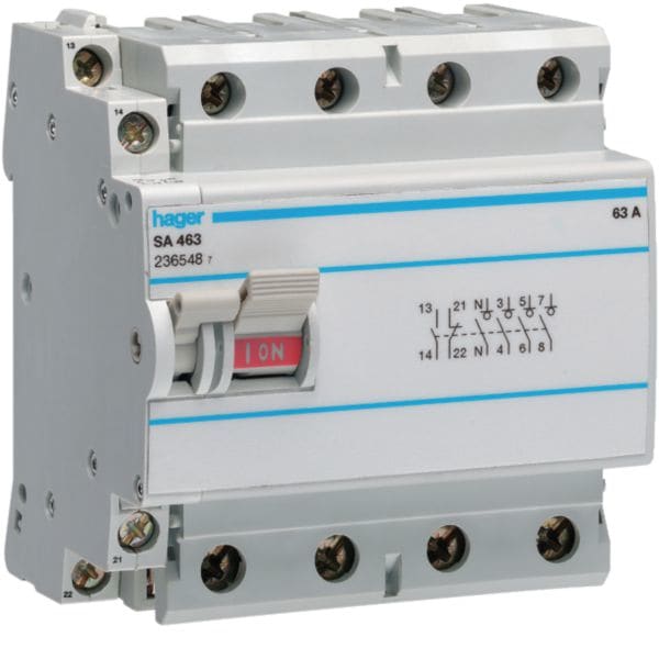HAGER BOCCHIOTTI - Interruttore non automatico 4 P 63 A 400 V AC accessoriabile 4.5 moduli DIN SA463