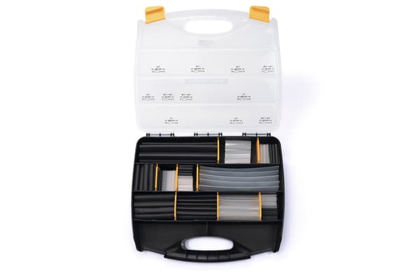 Guaina termorestringente con adesivo interno. La parete interna si fonde se riscaldata e si insinua negli interstizi. L'adesivo forma una barriera contro l'umidità quando la guaina si raffredda. Guaina nera per la protezione di connettori e derivazioni. Guaina trasparente ideale per la protezione delle etichette dei cavi. La dimensione degli scompartimenti può essere modificata spostando i divisori gialli. La guaina nera viene utilizzata principalmente per l'isolamento di derivazioni e connettori. La guaina trasparente invece viene tipicamente applicata come protezione dell'identificazione dei cavi.