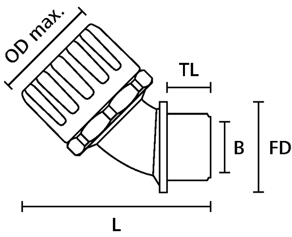 Formato da un unico elemento, ad inserimento rapido. Elevata resistenza agli strappi. Elevata resistenza a solventi ed olii. Zero alogeni, solfati e fosfati. Filetto maschio con controdado. Raccordo curvato a 45° con filetto maschio e guarnizione. IP66, IP67, IP68 e IP69K.