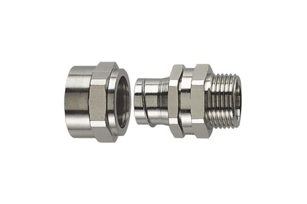 Raccordo in due elementi: involucro e corpo centrale con filetto maschio. Il filetto può ruotare rispetto al corpo del raccordo. Garantisce una tenuta sicura ed affidabile sulla guaina. Può essere fissato con un controdado. Raccordo girevole con filetto maschio in ottone nichelato.