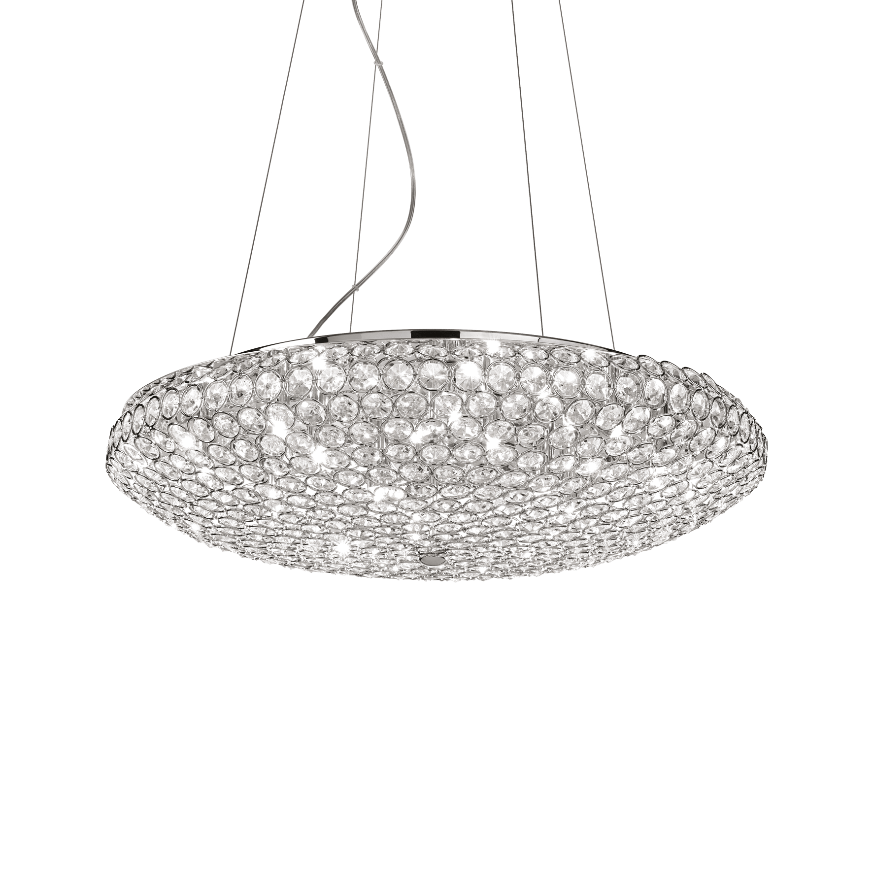 Diffusore composto da anelli in metallo cromato o dorato con ottagoni di cristallo incastonati all’interno. Sospensioni con cavi in acciaio a lunghezza regolabile da dispositivi automatici.