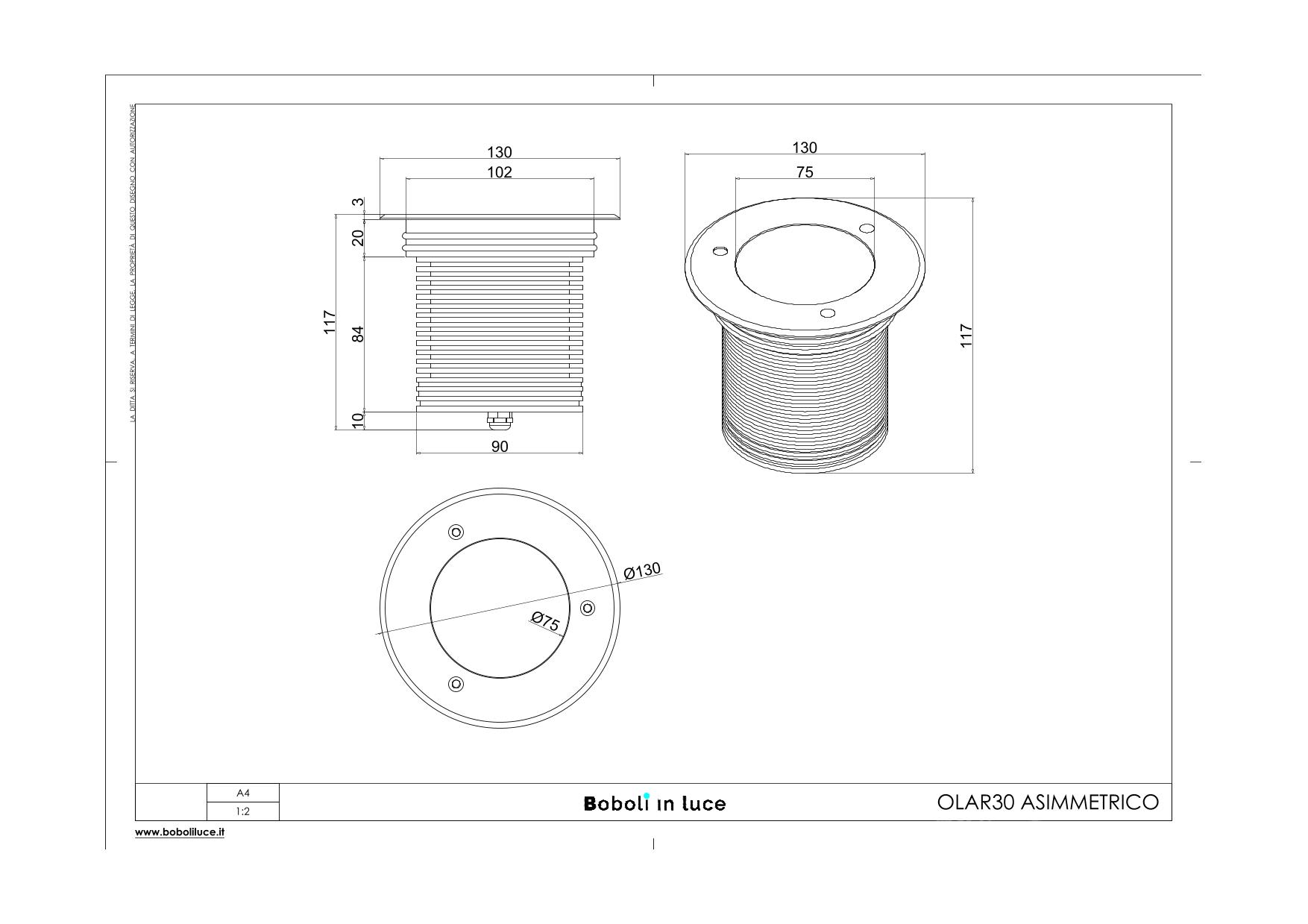 OLAR ASIMMETRICO 30 INCASSO IP67 230V 30W 15X25 3000K; INCASSO PER ESTERNO CARRABILE, CORPO E CONTROCASSA IN LEGA EN AW 6063 RICAVATO DA LAVORAZIONE MECCANICA A CNC PROTETTO CON PROCESSO DI PASSIVAZIONE GHIERA IN ACCIAIO INOX AISI 316L OTTICA ASIMMETRICA