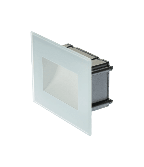 VITRUM503 ASIMMETRICO 230V 5W 4000K ON/OFF; INCASSO PER SCATOLA 503 IN LEGA EN AW 6063 RICAVATO DA LAVORAZIONE MECCANICA A CNC PROTETTO CON PROCESSO DI PASSIVAZIONE, SCHERMO TOTALE IN VETRO AD ALTO SPESSORE SERIGRAFASTO E SMERIGLIATO