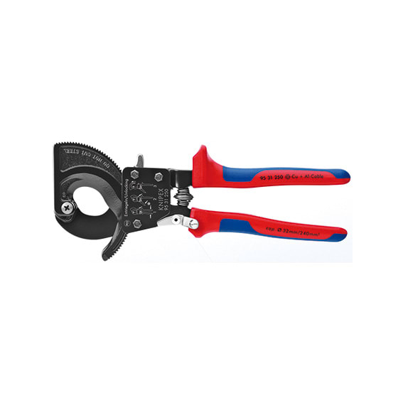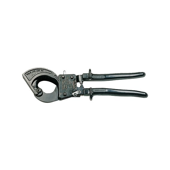 Cesoie a cremagliera per cavi elettrici. per il taglio netto, preciso e senza deformazione di cavi elettrici in rame ed alluminio ad uno o più conduttori a fili sottili. il rapporto ottimale fra la ganascia dentata e la leva, consente elevate prestazioni con taglio progressivo ad una sola mano con minimo sforzo. l’avanzamento a cremagliera è sbloccabile in qualsiasi posizione di taglio. avanzamento lama regolabile in due posizioni per adattarlo alle diverse forze di taglio. impiego anche in condizioni di spazi ristretti. adatte anche per spelare cavi. non adatte per funi di acciaio. tipo corto, in acciaio speciale bonificato a forte spessore, forgiato e temperato. manici rivestiti in resina termoplastica.