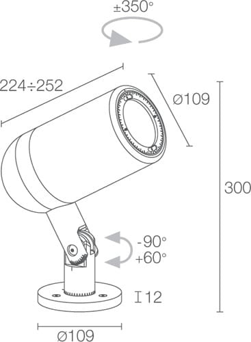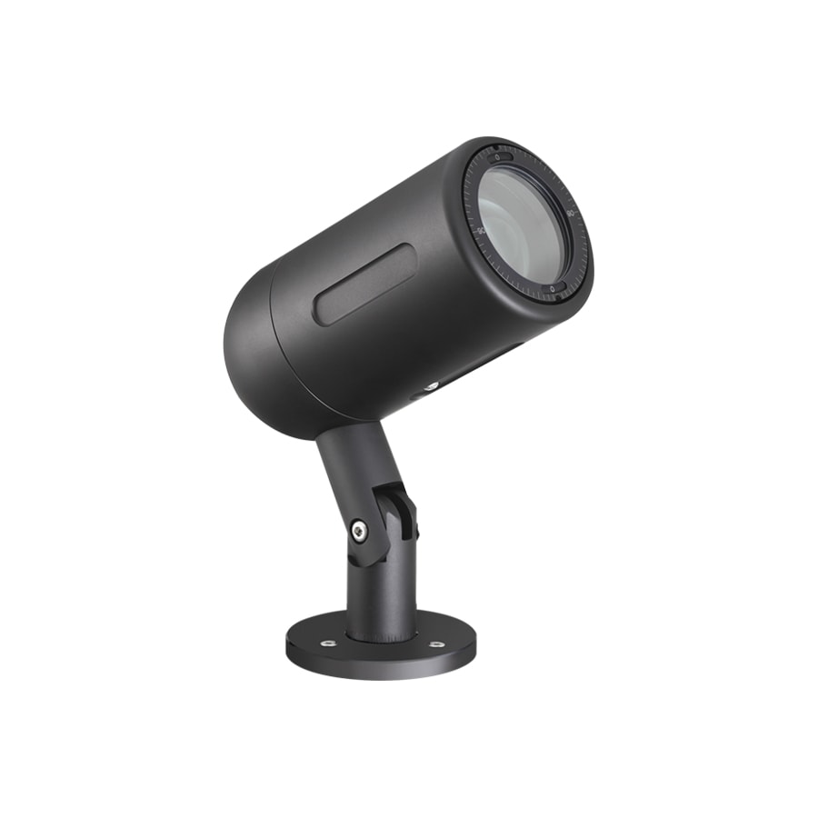 Proiettore da interno ed esterno; su superficie (soffitto, parete, pavimento, palo); corpo in lega di alluminio anodizzato lega EN AW 6082, schermo in vetro extrachiaro temprato; finiture: nero anodizzato; 1 COB power LED High Intensity; 37W - max 1050mA; alimentatore non incluso; incluso cavo in neoprene di 5 m H05RN-F 2x0,35/0,75 Ø6,3 mm; flusso sorgente: 3260 lm, ottiche: 16° ÷ 42°, colore LED: bianco 3000K; grado di protezione: IP66; grado di resistenza: IK06; temperatura di esercizio: da -20 °C a +45 °C; temperatura max apparecchio: 55°C (Ta 25°C); Glow wire test: 960°; sicurezza fotobiologica: gruppo rischio 1 secondo EN62471:2006; classe di isolamento III; peso 4,00 kg; dimensioni Ø109x237 mm.