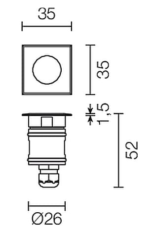 Apparecchio a incasso - 2W 4000K 500mA - forma quadrata - lato frontale 35mm. Apparecchio a incasso da esterno o interno; calpestabile e carrabile; CRI: >80; ottica: 10°; corpo in Acciaio Inox AISI 316L, ghiera in Acciaio Inox AISI 316L di spessore 1,5mm, schermo in vetro extrachiaro temprato con trattamento antigraffio di spessore 6mm; finitura: Acciaio Inox lucidato; temperatura di esercizio: -10°C +45°C; temperatura vetro: max 40°C (Ta 25°C); dotato di sistema IPS (utilizzare corrugato Ø20 min); grado di protezione contro i liquidi e i corpi solidi: IP68; grado di resistenza all'impatto IK08; Glow Wire Test: 960°; sicurezza fotobiologica: gruppo rischio 1 secondo EN62471:2006; montaggio con cassaforma WC0201/WC0202 o con accessorio ghiera con molle WG0300 per installazione a cartongesso; classe di isolamento III; peso 0,20kg; dimensioni corpo 35x35x52mm; foro d'incasso ø30mm; volume d'ingombro cassaforma Ø80x79mm; collegamento in serie, con cavo 1,5m tipo H05RN-F 2x0,75; dimmerazione disponibile mediante alimentatore dimmerabile; accessori disponibili: cassaforma WC0201/WC0202, molla WG0300 (spessore minimo 5mm), nido d'ape WH0101.