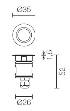Apparecchio a incasso da esterno o interno; 2W - 24Vdc; 1 power LED; 3000K; CRI: >80; ottiche: 40°; flusso totale: 88 lm (3000K); corpo in Acciaio Inox AISI 316L, ghiera in Acciaio Inox AISI 316L di spessore 10mm, schermo in vetro extrachiaro temprato con trattamento antigraffio di spessore 6mm; finitura: Acciaio Inox AISI 316L; temperatura di esercizio: -10°C +45°C; temperatura vetro: max 40°C (Ta 25°C); dotato di sistema IPS (utilizzare corrugato Ø20 min); grado di protezione contro i liquidi e i corpi solidi: IP68; grado di resistenza all'impatto IK08; sicurezza fotobiologica: gruppo rischio 1 secondo EN62471:2006; montaggio con cassaforma WC0201/WC0202, accessorio ghiera con molle WG0300 per installazione su pannellature, cartongesso; classe di isolamento III; peso 0,20kg; dimensioni ø35x52mm; foro d'incasso ø30mm; volume d'ingombro cassaforma Ø80x79mm; collegamento in parallelo, con cavo 1,5m tipo H05RN-F 2x0,75 Ø6,7mm; dimmerazione disponibile mediante dimmer in tensione; accessori disponibili: cassaforma WC0201/WC0202, molla WG0300 (spessore minimo 5mm), nido d'ape WH0101.
