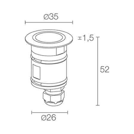 Bright 1.6 - Incasso da esterno (non adatto per immersione); a incasso (parete, pavimento); corpo e ghiera in acciaio inox AISI 316L, schermo in vetro trasparente temprato; 1 power LED; 2W - 24Vdc; incluso cavo in neoprene di 1,5 m H05RN-F 2x0,35/0,75 Ø6,3 mm; collegamento in serie; ottica 20°; colore LED: bianco - 4000K; grado di protezione: IP68; grado di resistenza: IK10; dotato di sistema IPS; temperatura di esercizio: -20°C +45°C; temperatura schermo: max 40°C (Ta 25°C); sicurezza fotobiologica: gruppo rischio 1 secondo EN62471:2006; classe di isolamento III; peso 0,20 kg; dimensioni corpo Ø35x52 mm; foro d’incasso Ø30 mm; volume tecnico per dissipazione : Ø80x100 mm; dimmerazione disponibile mediante dimmer in linea 24Vdc; accessori: cassaforma WC0201, cassaforma WC0202, molla di fissaggio WG0301 per installazione su cartongesso, nido d’ape WH0101. LED bianco 2W 4000K 20°.