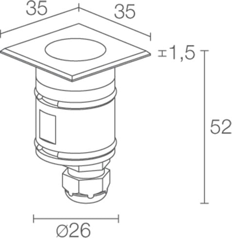 Incasso uplight da esterno (non adatto per immersione); a incasso (soffitto, parete, pavimento); corpo e ghiera in acciaio inox AISI 316L, schermo in vetro trasparente temprato, schermo in vetro acidato temprato (ottica diffusa). 2W. 88 lm. 3000 K. 20°.Quadrato