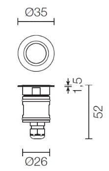 Apparecchio a incasso da esterno o interno; 1,2W – 12Vdc; 1 mid power LED; colore LED disponibile: RGB; ottiche: diffusa sabbiata; flusso totale: 65; 100; 40 lm per LED (R; G; B); corpo in Acciaio Inox AISI 316L, ghiera in Acciaio Inox AISI 316L di spessore 10mm, schermo in vetro extrachiaro temprato con trattamento antigraffio di spessore 6mm; finitura: Acciaio Inox AISI 316L; temperatura di esercizio: -10°C +45°C; temperatura vetro: max 40°C (Ta 25°C); dotato di sistema IPS (utilizzare corrugato Ø20 min); grado di protezione contro i liquidi e i corpi solidi: IP68; grado di resistenza all'impatto IK08; sicurezza fotobiologica: gruppo rischio 1 secondo EN62471:2006; montaggio con cassaforma WC0201/WC0202, accessorio ghiera con molle WG0300 per installazione su pannellature, cartongesso; classe di isolamento III; peso 0,35kg; dimensioni ø35x65mm; foro d'incasso ø30mm; volume d'ingombro cassaforma Ø80x79mm; collegamento in parallelo, con cavo 05RN-F 4x0.5/0.50 - Ø6.5mm; gestione RGB mediante controller a 3 canali con uscite in tensione, max 12Vdc; accessori disponibili: cassaforma WC0201/WC0202, molla WG0300 (spessore minimo 5mm).
