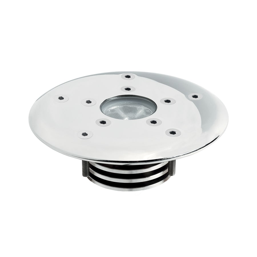 Incasso uplight da esterno e immersione; a incasso (parete, pavimento), profondità massima 10 m; corpo e ghiera in acciaio inox AISI 316L, schermo in vetro extrachiaro temprato trasparente. 6w. 500 mA. Blu. 24°. Colore Inox