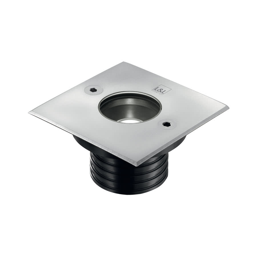 incasso da esterno (non adatto per immersione in piscine e fontane); a incasso (soffitto, parete, pavimento); 7W. Quadrato. 657 lm. 3000 K. 11°. 24VDC. Colore Inox.corpo in alluminio, ghiera in acciaio inox