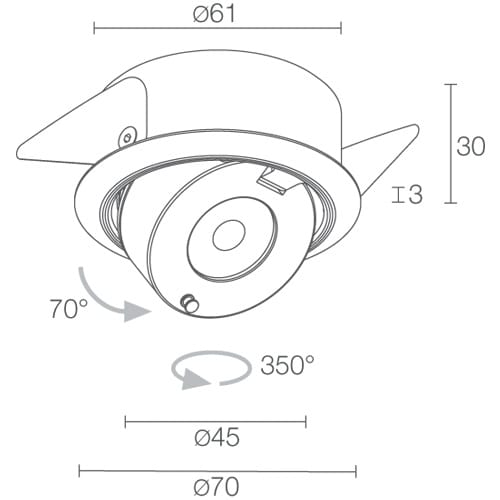 Ciak 2.7 codice: CK270015JN incasso downlight da interno a incasso (soffitto, mensola, vetrina) Potenza: 5W Alimentazione: 24Vdc Flusso sorgente: 452 lm (3000K) Flusso emesso: 303 lm (3000K, 32°) 1 power LED High Intensity, 3 step MacAdam, 50000h L95 B10 (Ta 25°C) Colore LED: 3000K Ottiche: 65°: sistema ottico composto da lente TIR ad alta efficienza Materiale corpo: radiatore in alluminio anodizzato nero con funzione di elemento di raffreddamento. Corpo e cornice da incasso in alluminio, ricavati completamente da lavorazione tornitura CNC. Molle in acciaio armonico AISI 301. Dotato di sistema di vincoli cardanici per orientamento nei 2 assi Finiture: corpo e cornice anodizzati nero opaco Finitura RAL su richiesta Installazione: l’altezza contenuta di 30 mm, ne permette l'installazione a incasso in ripiani di spessore ridotto come mensole per vetrine e teche, nel rispetto dei volumi di dissipazione Spessore della superficie d’incasso: min 5 mm, max 30 mm alimentatore non incluso incluso cavo in PVC di 1,5 m FROR 2x0,35/0,35 Ø3,5 mm Grado di protezione: IP40 CRI 90 l’emissione luminosa può essere indirizzata con precisione grazie all’orientabilità del corpo ottico: rotazione fino a 350° sull'asse verticale estrazione fino a 70° sull'asse orizzontale Sistemi di protezione: EPS protegge gli apparecchi per applicazioni da interno in caso di problematiche di carattere elettrico. Questa innovazione brevettata da L&L garantisce protezione elettrica da inversione di polarità, hotplug e sovratensioni fino a 48Vdc che possono verificarsi in caso di malfunzionamenti dell’impianto elettrico Temperatura di esercizio: 0°C — +45°C Temperatura massima apparecchio: 40°C (Ta 25°C) Sicurezza fotobiologica: gruppo rischio 1 secondo EN 62471:2006 Classe di isolamento: III Peso: 150 g Dimensioni: Ø70x30 mm Foro d’incasso: Ø65 mm Classe di consumo energetico: A / A+ / A++.Testato e approvato tramite E.O.L. test (End Of Line test) con prova di funzionamento e verifica dei parametri elettrici di assorbimento.