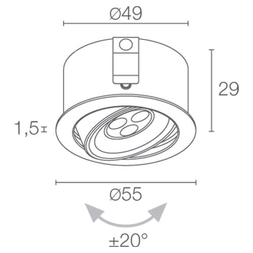 Esem Mid 1.1 codice: EM11315LN incasso downlight da interno a incasso (soffitto, parete, mensola) Potenza: max 3W Alimentazione: max 350mA Flusso sorgente: 309 lm (3000K, 350mA) Flusso emesso: 220 lm (3000K, 350mA, 22°) 3 power LED, 1/4 ANSI BIN, 50000h L95 B10 (Ta 25°C) Colore LED: 3000K Ottiche: 30° orientabile ±20° Materiale: corpo e ghiera in alluminio Finiture: nero Finitura RAL su richiesta Spessore della superficie d’incasso: min 5 mm, max 25 mm alimentatore non incluso Collegamento: in serie incluso cavo in PVC di 1,5 m FROR 2x0,35 Ø3,5 mm su richiesta disponibile la versione IP44 Temperatura di esercizio: 0°C — +45°C Temperatura massima apparecchio: 40°C (Ta 25°C) Sicurezza fotobiologica: gruppo rischio 1 secondo EN 62471:2006 Classe di isolamento: III Peso: 90 g Dimensioni: Ø55x29 mm Foro d’incasso: Ø50 mm Volume tecnico per dissipazione: Ø90x80 mm Classe di consumo energetico: A / A+ / A++ Testato e approvato tramite E.O.L. test (End Of Line test) con prova di funzionamento e verifica dei parametri elettrici di assorbimento.