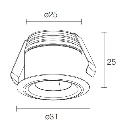 Esem Mini 1.0. Incasso downlight da interno; a incasso (soffitto); corpo e ghiera in alluminio anodizzato lega EN AW 6082; finiture: alluminio anodizzato; 1 power LED; max 2W - max 500mA; inclusi 2 cavi unipolari di 0,50 m; collegamento in serie; ottiche: 30°; colore LED: bianco - 2700K; grado di protezione: IP20; temperatura di esercizio: 0°C +45°C; temperatura schermo: max 40°C (Ta 25°C); sicurezza fotobiologica: gruppo rischio 1 secondo EN62471:2006; classe di isolamento III; peso 0,045 kg; dimensioni Ø31x25 mm; foro d’incasso Ø27 mm; volume tecnico per dissipazione: Ø90x60 mm.