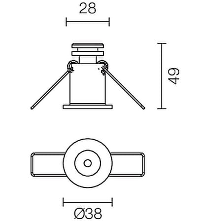 Apparecchio a incasso da interno; 2W - 350/500mA; 1 power LED Multi-chip; 3000K; CRI: >80; ottica: 36°; flusso totale: 122 lm (3000K a 500mA); corpo in alluminio lega EN AW 6012 con trattamento di anodizzazione bianca, cornice in alluminio lega EN AW 6012 verniciata bianco opaco Ral9003; finitura: bianco; temperatura di esercizio: 0°C +45°C; dotato di sistema EPS; grado di protezione contro i liquidi e i corpi solidi: IP40, IP44 installato; sicurezza fotobiologica: gruppo rischio 1 secondo EN62471:2006; montaggio a incasso con molle in Acciaio Inox in controsoffitti di spessore da 5mm a 25mm; classe di isolamento III; peso 0,06kg; dimensioni ø38x49mm; foro d'incasso ø30mm; volume d'ingombro: Ø130x90mm; collegamento in serie, cablato con cavo 1,5m tipo Fror Ø3,5 2x0,35.