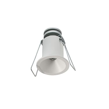 Apparecchio a incasso da interno; 2W - 350/500mA; 1 power LED Multi-chip; 4000K; CRI: >80; ottica: 36°; corpo in alluminio lega EN AW 6012 con trattamento di anodizzazione bianca, cornice in alluminio lega EN AW 6012 verniciata bianco opaco Ral9003; finitura: bianco; temperatura di esercizio: 0°C +45°C; dotato di sistema EPS; grado di protezione contro i liquidi e i corpi solidi: IP40, IP44 installato; sicurezza fotobiologica: gruppo rischio 1 secondo EN62471:2006; montaggio a incasso con molle in Acciaio Inox in controsoffitti di spessore da 5mm a 25mm; classe di isolamento III; peso 0,06kg; dimensioni ø38x49mm; foro d'incasso ø30mm; volume d'ingombro: Ø130x90mm; collegamento in serie, cablato con cavo 1,5m tipo Fror Ø3,5 2x0,35.