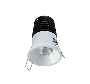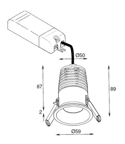 Apparecchio a incasso da interno; 8W - 230Vac 50Hz; 1 power LED Multi-chip; 3000K; CRI: >80; ottica: 54°; flusso totale: 425 lm (3000K); corpo in alluminio lega EN AW 6012 con trattamento di anodizzazione nera, cornice in alluminio lega EN AW 6012 verniciata bianco opaco Ral9003, schermo protettivo in PMMA ad alta riflettanza; finitura: bianco, nero; temperatura di esercizio: 0°C +45°C; grado di protezione contro i liquidi e i corpi solidi: IP40, IP44 installato; sicurezza fotobiologica: gruppo rischio 1 secondo EN62471:2006; montaggio a incasso con molle in Acciaio Inox in controsoffitti di spessore da 5mm a 25mm; classe di isolamento II; peso 0,30kg; dimensioni ø59x89mm; foro d'incasso ø50mm; volume d'ingombro: Ø170x150mm; collegamento 230Vac 50Hz, cablato con alimentatore; dimmerazione disponibile mediante DALI, 1-10V, PUSH; in dotazione: alimentatore cablato,ad alta efficienza e PFC attivo; dimensioni alimentatore: 111x37x28 mm, 111x52x22 mm (1-10V + PUSH), 207x42x31 mm (DALI + PUSH).