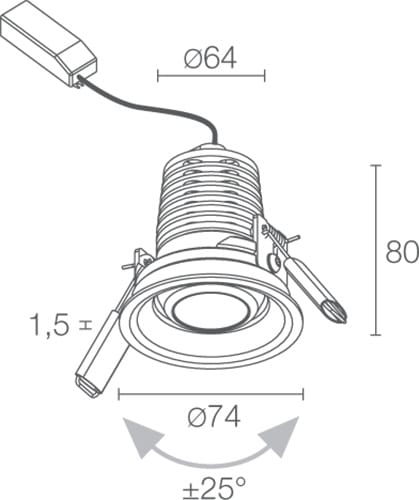 Esem 3.1 codice: ES31009MB incasso downlight da interno a incasso (soffitto) Potenza: 8W Alimentazione: 230Vac Flusso sorgente: 512 lm (3000K) Flusso emesso: 425 lm (3000K, 30°) 1 power LED multichip, 2 step MacAdam, 50000h L90 B10 (Ta 25°C) Colore LED: 4000K Ottiche: 30° orientabile ±25° Materiale: corpo e ghiera in alluminio Finiture: bianco Finitura RAL su richiesta Spessore della superficie d’incasso: min 5 mm, max 25 mm alimentatore incluso incluso cavo di 0,30 m Gestione: ON/OFF Grado di protezione: IP40 Temperatura di esercizio: 0°C — +45°C Temperatura massima apparecchio: 40°C (Ta 25°C) Sicurezza fotobiologica: gruppo rischio 1 secondo EN 62471:2006 Classe di isolamento: II Peso: 300 g Dimensioni: Ø74x80 mm Foro d’incasso: Ø65 mm Volume tecnico per dissipazione: Ø180x150 mm Classe di consumo energetico: A / A+ / A++ Testato e approvato tramite E.O.L. test (End Of Line test) con prova di funzionamento e verifica dei parametri elettrici di assorbimento.