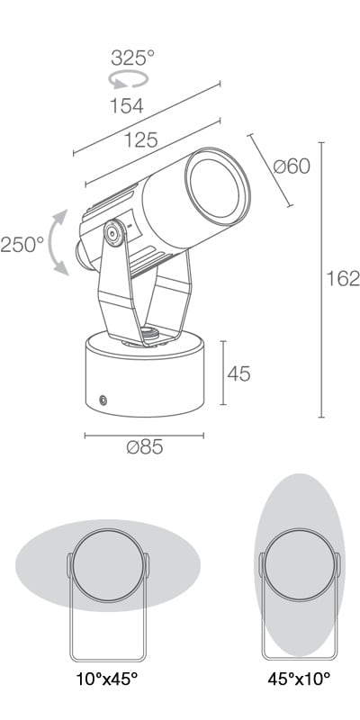 Proiettore da interno ed esterno; su superficie (soffitto, parete, pavimento, picchetto); corpo in alluminio anticorodal lega 6082, schermo in vetro extrachiaro trasparente temprato serigrafato. 7W. 3000 K. 9°. Colore Bianco.