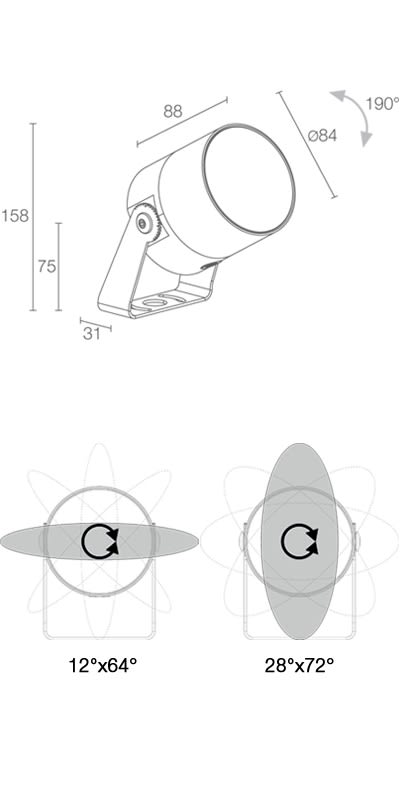 Proiettore da esterno; su superficie (soffitto, parete, pavimento, picchetto). 15W. 24 VDC. 3000 K. 28°+72°. Colore Bianco. 1343 lm