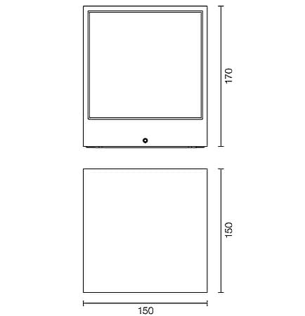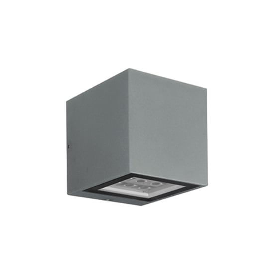 Applique da interno o esterno; 18W (9 LED) - 230Vac 50Hz; 5 power LED; 3000K; CRI: 75÷85; ottica: F (30°); flusso totale: 1137 lm; corpo in alluminio pressofuso, schermo emissione in vetro temprato e serigrafato; finitura: verniciatura per esterni -grigio; temperatura di esercizio: -10°C +45°C; grado di protezione contro i liquidi e i corpi solidi: IP65; grado di resistenza all'impatto IK05; Glow Wire Test: 960°; sicurezza fotobiologica: gruppo rischio 1 secondo EN62471:2006; montaggio con viti e tasselli; classe di isolamento I; peso 3,00kg; dimensioni 150x150x170mm; collegamento 230Vac 50Hz, con cavo fornito di muffola stagna al gel per cablaggi in esterni; alimentatore integrato.