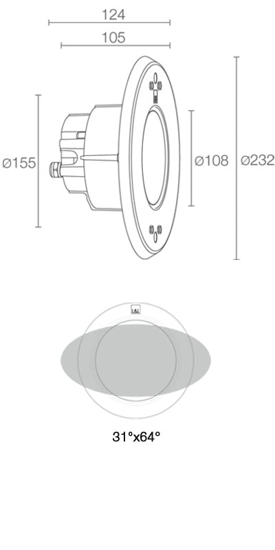 Incasso da immersione (non adatto per immersione in acqua salata, non adatto per applicazioni fuori dall’acqua); a incasso (parete), profondità max 10 m; corpo in tecnopolimero termoconduttivo, ghiera in acciaio inox AISI 316L; schermo in vetro extrachiaro temprato; finiture: acciaio inox microsabbiato. 20W. 3000 K. 34°. 1078 lm