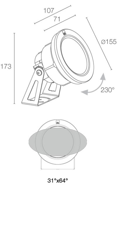 Proiettore da immersione (non adatto per immersione in acqua salata, non adatto per applicazioni fuori dall’acqua); su superficie (parete, pavimento); corpo in tecnopolimero termoconduttivo, ghiera in acciaio inox AISI 316L; schermo in vetro extrachiaro temprato; staffa in acciaio inox AISI 316L; finiture: acciaio inox microsabbiato; 20 W. 3000 K. 34°. 1078 lm