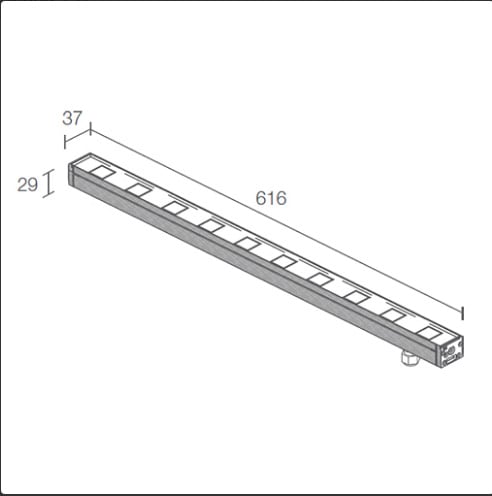 Neva 1.0 - Profilo lineare da esterno, calpestabile; su superficie (soffitto, parete, pavimento) con staffe, a incasso (soffitto, parete, pavimento) con cassaforma; corpo in alluminio estruso anodizzato lega EN AW 6060, schermo in vetro temprato serigrafato; 10 power LED passo 60 mm; 25W - 24Vdc; incluso cavo in neoprene di 1,5 m H05RN-F 2x0,75 Ø6,3 mm; ottiche: 45°; colore LED: bianco - 2700K; grado di protezione: IP67; grado di resistenza: IK06; dotato di sistema IPS integrato nel pressacavo; temperatura di esercizio: -20°C+45°C; temperatura schermo: max 40°C (Ta 25°C); Glow wire test: 960°; sicurezza fotobiologica: gruppo rischio 1 secondo EN62471:2006; classe di isolamento III; peso 1,15 kg; dimensioni 616x37x29mm; dimmerazione disponibile mediante dimmer in linea 24Vdc; accessori: cassaforma WC6510, cassaforma per cartongesso WC6710, coppia staffe h 75 mm WM0601, coppia staffe h 140 mm WM0602, kit anticaduta WN6001, nido d'ape WH6010, frangiluce in acciaio inox verniciato nero WB6510. LED bianco 25W 2700K 45°.