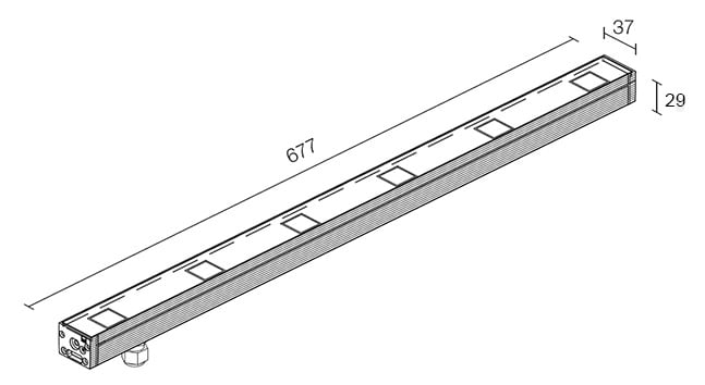 Profilo lineare da interni ed esterni; calpestabile; 20W - 24 Vdc; 6 gruppi RGB LED passo 120mm; colore LED disponibile: RGB; ottica arretrata: 26°; flusso totale: 44lm/gruppo 3 LED RGB; corpo in alluminio estruso anticorodal lega EN AW 6060 con trattamento di anodizzazione; schermo in vetro extrachiaro temprato e serigrafato, ottiche arretrate antiabbagliamento; temperatura di esercizio: -10°C +45°C; temperatura vetro: max 40°C (Ta 25°C); dotato di sistema IPS nel pressacavo; grado di protezione contro i liquidi e i corpi solidi: IP67; grado di resistenza all'impatto IK06; Glow wire test: 960°; sicurezza fotobiologica: gruppo rischio 1 secondo EN62471:2006; montaggio su superficie (soffitto, parete, pavimento) mediante staffe orientabili oppure ad incasso (pavimento, parete) con cassaforma; classe di isolamento III; peso: 1,15kg; dimensioni 677x37x29m; collegamento in parallelo; incluso 1,5 m di cavo in neoprene 05 RN-F 4x0.5 Ø6,3; dimmerazione disponibile mediante utilizzo di dimmer in linea 24Vdc; accessori: cassaforma WC6520; cassaforma per cartongesso WC6720; coppia molle WN6003; nido d’ape WH6020; frangiluce in acciaio inox WB6520; kit allineamento casseforme WN6005; coppia staffe regolabili WM0601 (h 75mm)/WM0602 (h 140mm); coppia estrattori WN6004; kit anticaduta WN6001.