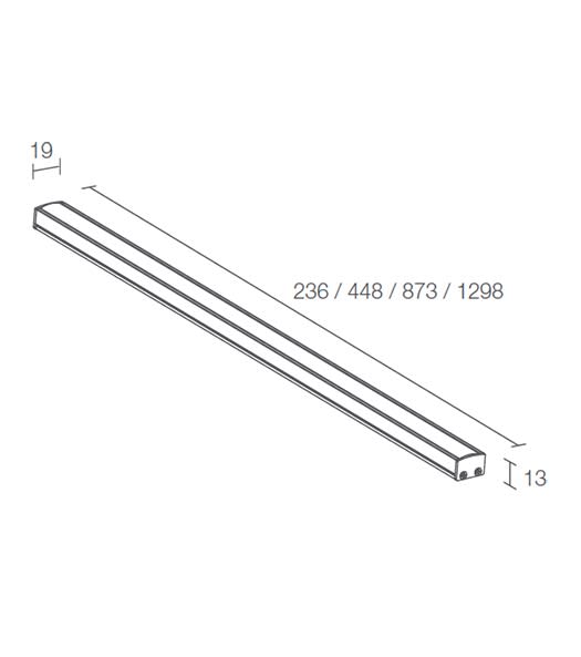 Applicazione: profilo lineare da interno. Montaggio: su superficie (soffitto, parete). Materiale: corpo in alluminio anodizzato, schermo in policarbonato satinato. Potenza LED: 17W. Alimentazione: 24Vdc. Flusso totale apparecchio: 1020 lm (3000K, 873 mm).