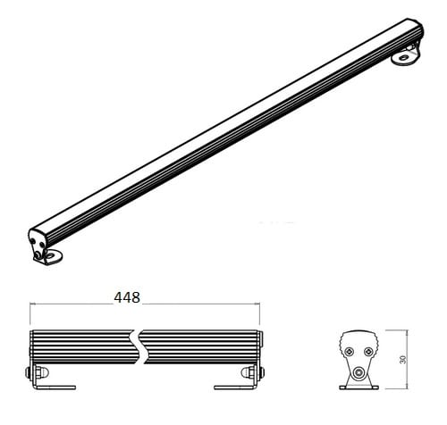 Profilo lineare da interno; su superficie (soffitto, parete); corpo in alluminio anodizzato lega EN AW 6060, schermo in policarbonato trasparente o satinato; 60 mid power LED; 9W (448 mm) - 24Vdc; incluso cavo in PVC di 1,5 m FROR 2x0,35 Ø3,5 mm; flusso totale: 510 lm (3000K, 448mm); ottica diffusa; colore LED: bianco - 3000K; grado di protezione: IP40; temperatura di esercizio: 0°C +45°C; temperatura schermo: max 40°C (Ta 25°C); sicurezza fotobiologica: gruppo rischio 1 secondo EN62471:2006; classe di isolamento III; peso 0,50 kg/m; dimensioni 30x20 mm; dimmerazione disponibile mediante dimmer.